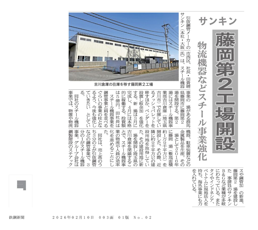 鉄鋼新聞にて当社記事が2件掲載されました。藤岡第2工場開設と80周年記念品についての記事です。ご紹介させていただきます。